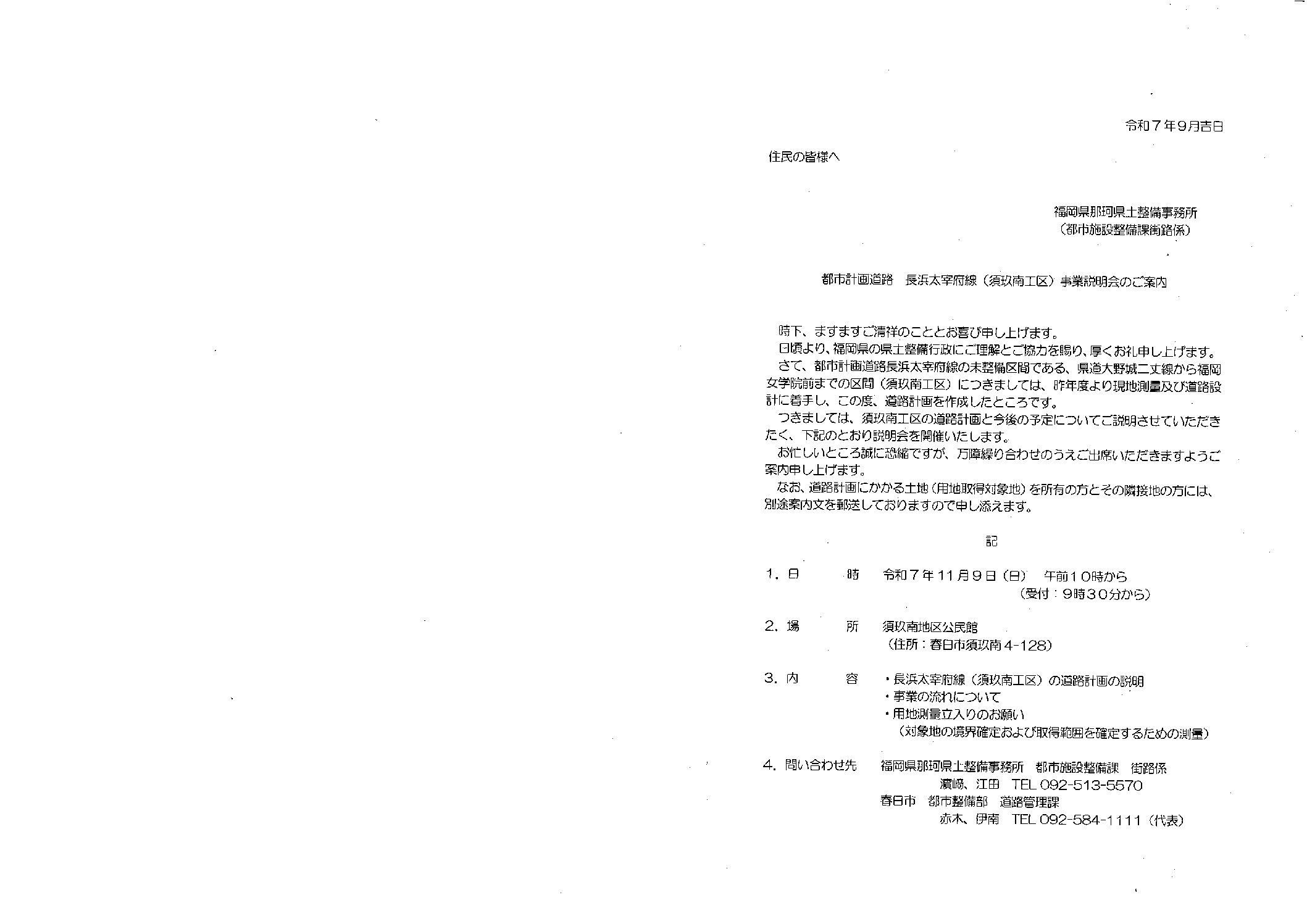 長浜太宰府線事業説明会について 2025年10月29日 11月9日(日)10:00から(受付9:30から) 都市計画道路 長浜太宰府線(須玖南工区)の事業説明会が行われます。 道路計画の説明や事業の流れについて説明がありますので、 ご興味のある方は、須玖南公民館までお越しください。 DOC251029-20251029095602